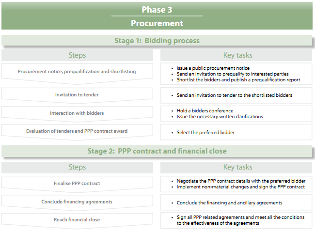 The procurement phase, as the term is used in this Guide, commences with the publication of the procurement notice and ends with financial close, the point at which project activities (beginning with detailed design and construction) can start. It has been broken down for convenience into two stages: (i) the bidding process and (ii) the period from the selection of the preferred bidder to financial close. The chart below outlines the stages and steps in the procurement phase.