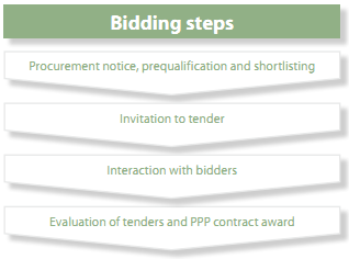 The PPP bidding process involves a series of steps summarised in the chart below. The goal of the bidding process is to maximise value for money by creating appropriate incentives through a competitive process for the award of the long-term PPP contract.