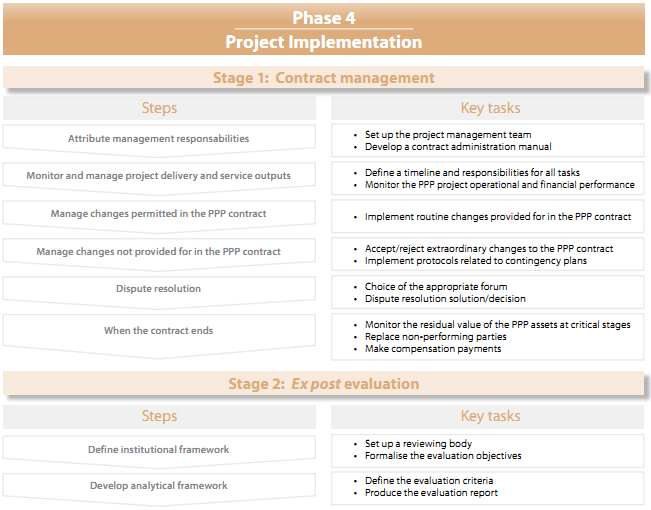 This chapter deals with the period during which the PPP project is being implemented (i.e. from financial close to the expiry of the PPP contract). It addresses the most common issues which officials at the Authority may have to face during the life of the project. A PPP project implies regular monitoring of performance and to take appropriate actions in accordance with the terms of the PPP contract. In some circumstances, a project may require changes to the contract (e.g. modifying the service specifications or the scope of the project). The chart below summarises the main stages and steps involved in the project implementation phase of a PPP.