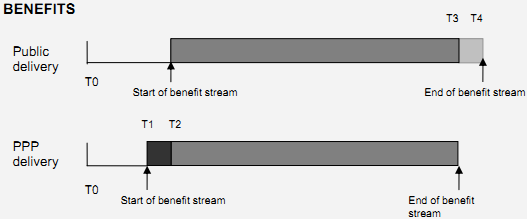 ∙ Better on-time construction performance: This is largely a result of the financial incentives incorporated into the terms of PPP contracts. These incentives apply to equity investors, lenders and contractors. The principle of "no service - no payment" ensures that the private sector is heavily incentivised to deliver to time (even where the private partner may have to absorb additional costs in the process)4. In practice, much of the project financial and technical due diligence carried out before contract signature is focused on ensuring the best possible conditions for on-time delivery of the infrastructure. PPPs impose a structure and a set of clearly defined and agreed timescales. PPP contracts also provide clear mechanisms for dealing with variants and delay events;
