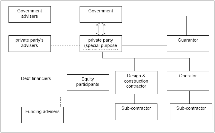Throughout this document, the term 'private party' is used to describe the private sector entity with which government contracts. This may be a 'special purpose vehicle' created specifically for the purposes of the project. The private party is not limited to this form, however, and can be set up under a number of structures including; as a subsidiary of an existing company, a joint venture or a trust structure. Behind the private party there may be a number of private sector parties (the consortium) who will be seeking to have their interests represented through the private party. Government needs to appreciate each of these groups' interests when negotiating its position.