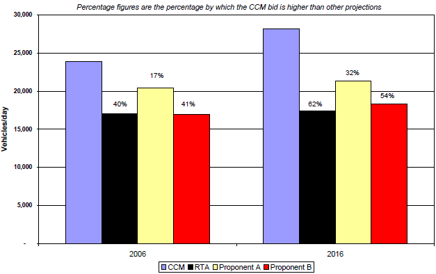 ■ for 2006, CCM's patronage projections for the main tunnel were six per cent higher than the benchmark, ten per cent higher than proponent A, and 54 per cent higher than proponent B