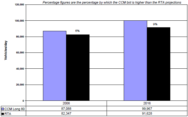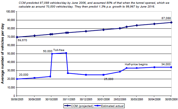 It is still early to judge the longer-term accuracy of projections. We show in Exhibit 2.5 that since the opening of the tunnel, an average of fewer than 25,000 vehicles per day have used the tunnel while the toll has been at full price. This is less than a third of CCM's forecast and of the patronage the RTA predicted.