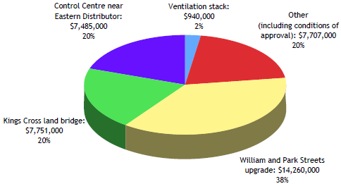 The three main such changes related to the redevelopment of William and Park Streets, the extension of the land bridge at the eastern end of the Kings Cross Tunnel, and a requirement to change the Tunnel Control Centre for the Cross City Tunnel to ensure the capacity of the roof of the Eastern Distributor was sufficient to carry the Tunnel Control Centre.
