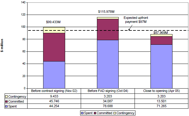 Exhibit 3.3 shows that at the signing of the contract, and the FAD stage, all of the upfront payment had been allocated - i.e. no BCF would remain. This Exhibit also shows about $9 million ($97 million minus $88 million) not allocated close to the tunnel opening in April 2005. The RTA advised that this $9 million will be used for unsettled claims. Clearly, the RTA could not have contributed more to the FAD costs from the upfront payment.