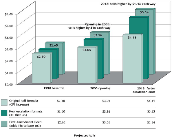* Future CPI increases estimated based on the average CPI increase between 1998 and 2005 ** The 15 cents base toll increase becomes a 20 cents increase by 2005, and a 31 cents increase by 2018 after the application of the new escalation formula. Note: After 2018 the toll escalation goes back to CPI only so the main effect of the two changes will have been felt by then. | ||||||