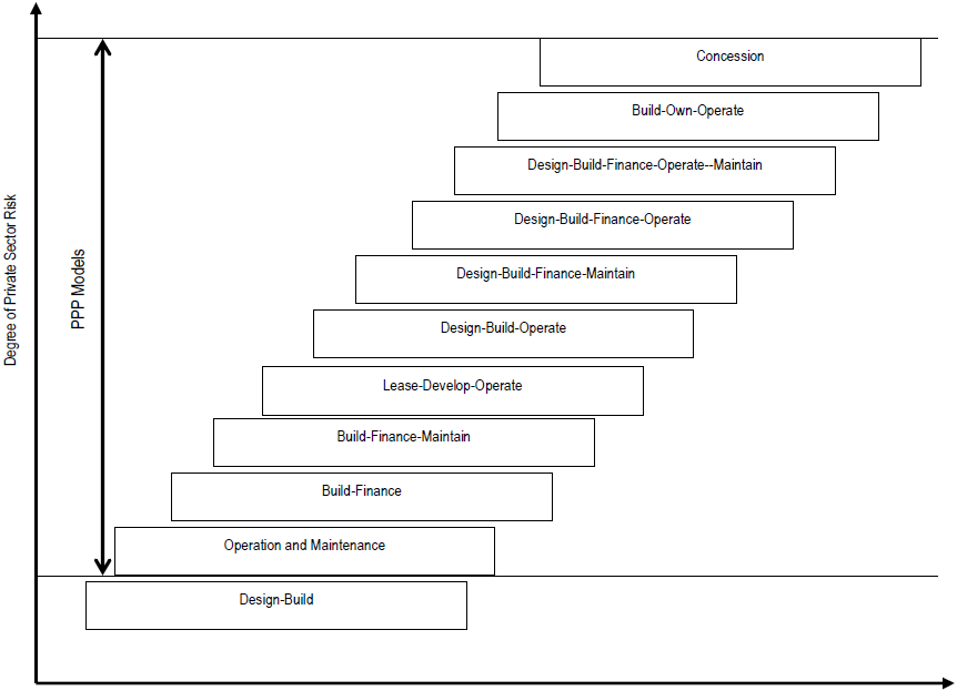 There are a range of PPP models that allocate responsibilities and risks between the public and private partners in different ways. The following terms are commonly used to describe typical partnership agreements:
