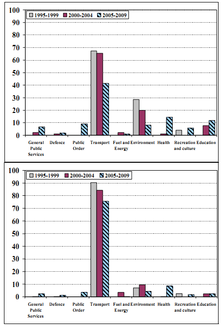 As shown in Figure 3, the sectoral distribution outside the UK remains concentrated in transport, but gradually diversifies. Over the past 5 years, the transport sector represented 41% of the number and 76% of the value of PPPs in continental Europe. Education and health PPPs are gaining ground, but remain less significant than in the UK. Together they constitute 26% of the number and 11% of the value of PPPs in continental Europe in 2005-09 (in the UK 69% and 51%, respectively). The importance of the environmental sector in PPPs decreased over time, particularly by number.