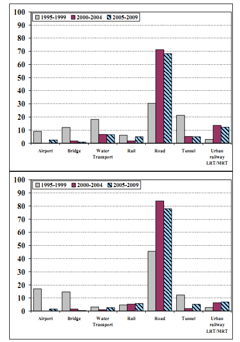 For a finer breakdown, Figure 4 shows the composition of transport PPPs in continental Europe by various sub-sectors. Outside the UK roads remain by far the dominant component of transport PPPs representing more than two thirds of its total number and value. The importance of urban railway increased; the importance of bridges, tunnels and airports decreased.