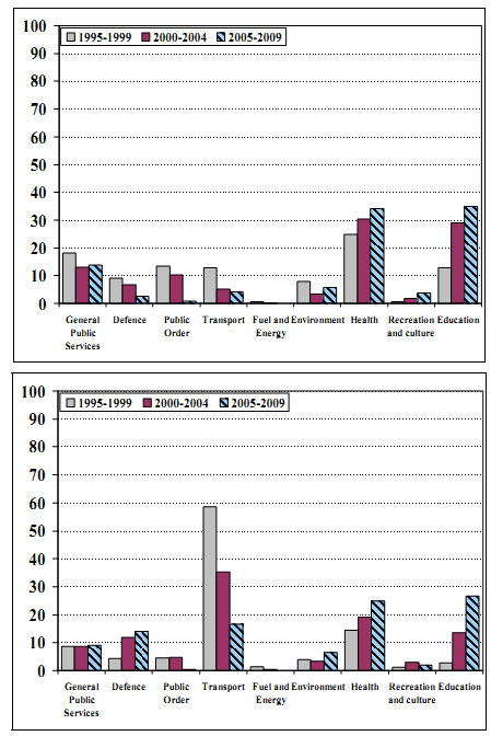 Starting with the UK, Figure 2 shows the sectoral distribution of its PPPs by number (top panel) and by value (bottom panel). By number, PPPs in education (35% of total) and health (34%) are most important in the UK and kept growing. The number of PPPs in general public services is large as well (14%), but remained fairly stable. In contrast, transportation has fallen to only 4% of the number of PPPs. Also the number of projects in defence and public order and safety declined over time.