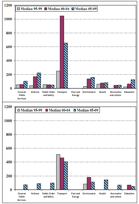 In the UK (top panel), PPP projects in the transport sector are typically by far bigger than in other sectors. The recent decline in the size of transport PPPs may be due to some large PPPs related to the London underground at the beginning of this decade. In most other sectors, with the exception of transport and public order, the typical project size has increased over time. The guidance by HM Treasury (2006) to favour larger projects (above EUR 30 million)8 is one reason for this trend.