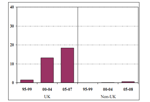Figure 7 suggests that in the UK PPPs represent about 10% of total investment in the transport sector. In contrast, transport PPPs in continental Europe play a smaller role but caught up and reached about 5% in 2005-08.