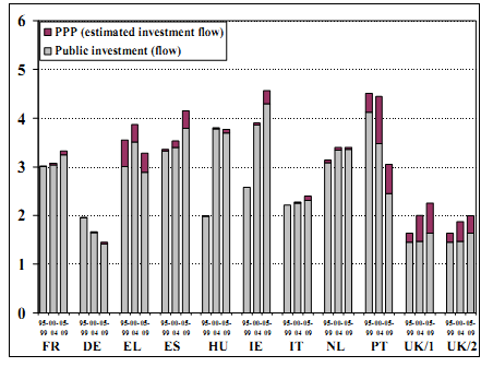 Only for the UK actual PPP investment flow numbers are publicly available. To see the difference between our own estimates of PPP investment flows (UK/1) and the numbers published by HMT (UK/2), we present both numbers. There are two reasons why PPP investment flows published by HMT differ from our own data. First our definition of PPPs does not exactly correspond to the definition of PPPs by HMT. Second, our way of estimating investment flows through spreading the value of projects of five years is imprecise. Though our own data (UK/1) point towards a slightly higher macroeconomic significance than the HMT data (UK/2) do, our estimates seem to be reasonable.