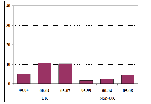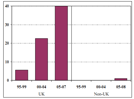 Figure 9 shows that in the health sector PPPs are also a significant source of investment in the UK. Starting from about 5% during the period 1990-94, PPPs represented almost 40% of total investment in health in the period 2005-07. With only about 1% of total sector investment, PPPs in health are so far of limited significance outside the UK.