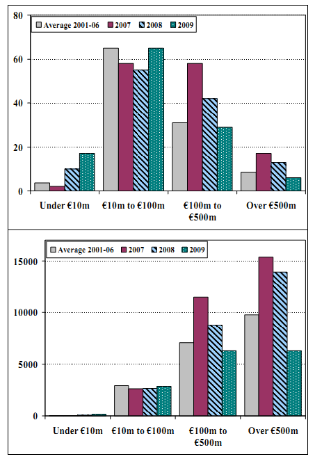 Figure 11. Number (top panel) and value (bottom panel, in € millions) by size of PPPs.