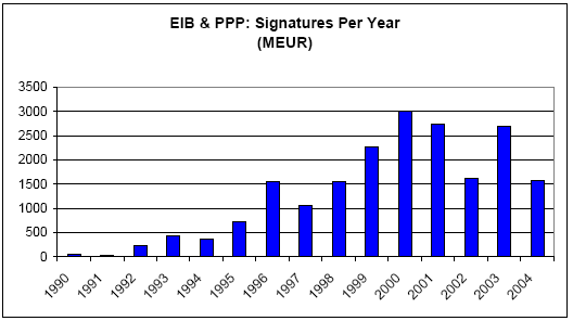The main growth in the portfolio began with loans to projects under the UK Private Finance Initiative (PFI). The UK PFI dates back to 1992, but has developed rapidly since 1997 and similar schemes have been adopted in many other EU Member States. The Bank is now lending to PPP projects in Belgium, Denmark, Germany, Spain, France, Greece, Ireland, Italy, Netherlands, Austria, Poland, Portugal and the U.K., as well as in non-Member States, e.g. China and South Africa. The EIB is one of the largest individual lenders to PPPs, by volume, within the EU. An outline of the growth in the Bank's PPP operations, and a breakdown by sector is presented below. Further information can be found in "The EIB's role in Public-Private Partnerships (PPPs)".