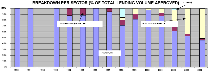 The EIB's PPP exposure may be traced back to the loans made in 1987 to Eurotunnel (France/UK), in 1989 for the Orlyval project (France), and in 1992 for the Second Severn Crossing project (U.K.). These projects offered the Bank the opportunity to learn a number of valuable lessons. At the same time, project-finance lending techniques were being developed through the Bank's involvement with private-sector project finance deals in power industry in the U.K. and elsewhere. A breakdown of the Bank's portfolio by sector can be found in Appendix I.