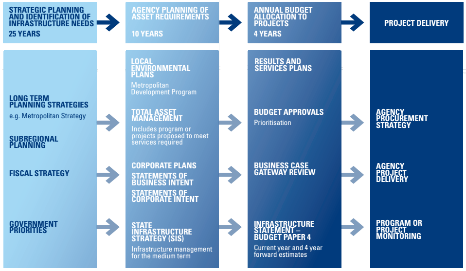 - The State Infrastructure Strategy links agency asset acquisition strategies with whole-of-government activities such as the Sydney Metropolitan Strategy and the State Budget.