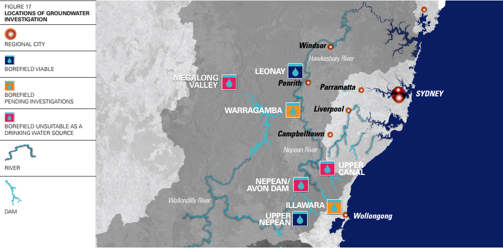 - Groundwater investigations indicate that there are promising reserves at Kangaloon and Leonay near Penrith. This will be accessed if Sydney dam levels fall below 40 per cent.
