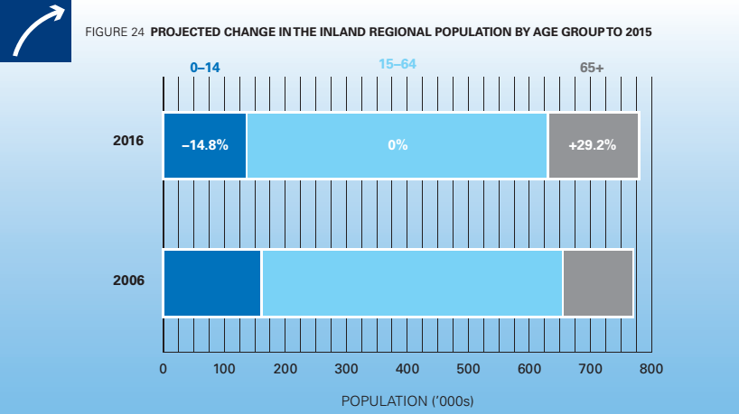 - Population projections for Inland New South Wales indicate an increase of some 9,910 people, or 1.3 per cent between 2006 and 2016. In the inland areas of the State, the largest population increases are projected in the Central West, Murrumbidgee and Murray. In terms of age the regional change is not expected to be uniform with: