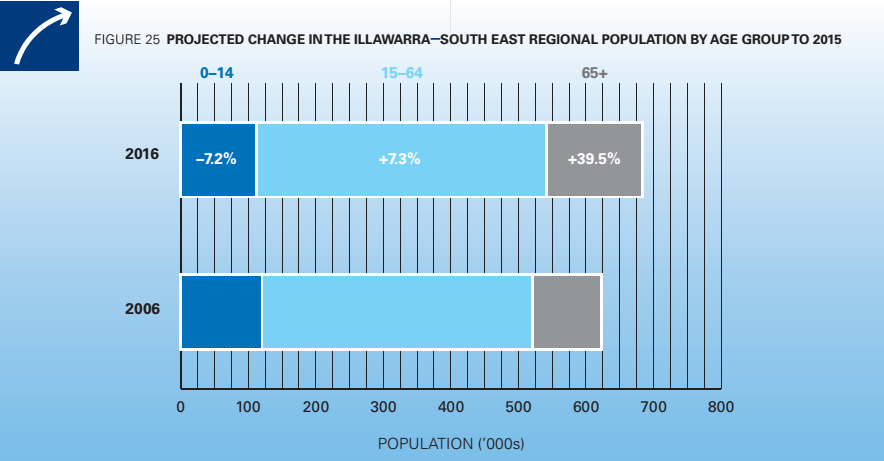 - Population projections for the Illawarra-South East indicate an increase of some 60,700 people, or 9.7 per cent between 2006 and 2016. This increase is not expected to be uniform across age groups with: