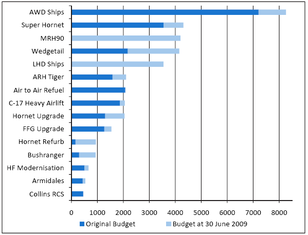 11 Two projects, MRH90 and LHD Ships, used an acquisition strategy involving only a small initial budget approval ($3.3 million and $3.1 million respectively), and together accounted for $6.3 billion of the $8.3 billion real variations to project budgets as at 30 June 2009. In the case of the Wedgetail project, a real variation was recorded under the project's budget approval history in July 2008 to fund price and exchange variations.