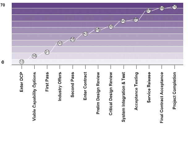 1.37 The DMO's Project Maturity Score quantifies the maturity of a project by way of an objective score based on the project managers' judgement at defined milestones in its capability development and acquisition phases. This score is then compared against an ideal or benchmark score for that milestone. A project's maturity is assessed at 13 milestones across its lifecycle and for each of these milestones the ideal or benchmark condition is represented by a benchmark score as shown in Figure 1.1.