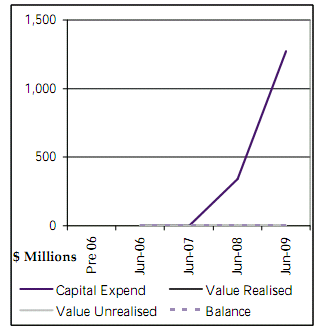 As at June 2009, the project is yet to realise any value of its capital expenditure as assets accepted into service. This should change in 2010 as aircraft are accepted into service.
