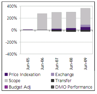 | Since Second Pass budget approval of $957m, price indexation and foreign exchange variations have accounted for $884m of total budget variation. Significant real variations include: a June 2006 Government approved acquisition of a further 34 MRH90 helicopters to replace the Black Hawk (Phase 4) and Sea King (Phase 6) fleets resulting in a scope change of $2,566m; and a transfer of $219m in October 2006 to DSG for facilities. |