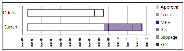 The schedule forecast for IOC and FOC has slipped by 48 months from the original plan caused by delays to system delivery as a result of problems associated with sub-system integration, supplier hardware availability, radar and electronic support measures maturity, and aircraft modification.