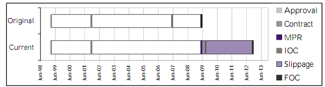 The schedule forecast for FOC has slipped by 42 months from the original plan. Whilst the final aircraft is expected to be delivered by September 2010 and project deliverables complete by June 2011, the FOC will not be achieved until December 2012. The apparent 12 month delay from the 2007-08 MPR to this report for FOC is due to a more accurate measure of when the complete ARH regimental unit is a fully trained operational capability rather than the point at which operationally capable aircraft and systems are delivered by the project. There have been no major changes to actual project schedule since the 2007-08 MPR.