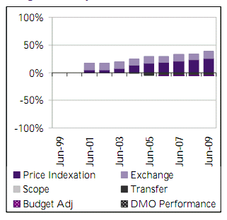 | Since Second Pass budget approval of $1,58401, price indexation and foreign exchange variations have accounted for $608m of total budget variation. Significant real variations include transfers of $18m in October 2002 and $59m in December 2003 to DSG for infrastructure at Oakey and Darwin respectively. |