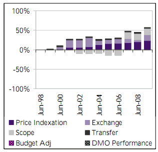 | Since Second Pass budget approval of $1,30001, price indexation and foreign exchange variations have accounted for $488m of the total budget variation. Significant real variations for the project include: Reduction of $132m in July 2001 as a result of White Paper considerations; a transfer to a Major Capital Equipment Program for Radio Frequency Jammer of $67m in December 2004; and approved scope increase of $413m to include Hornet Electronic Warfare Self Protection Suite upgrade being conducted under Phase 2.3 of the project. |