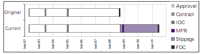 The schedule forecast for FOC, which was not stipulated until August 2008, has slipped by 33 months caused by problems with satisfying Navy Operational Release requirements.