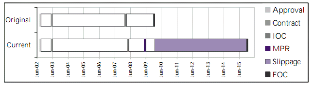 The schedule forecast for FOC has slipped by 72 months from the original plan caused by the impact that emergent defects within the platform and other capability upgrades have had on the submarine availability for installation of replacement combat systems.