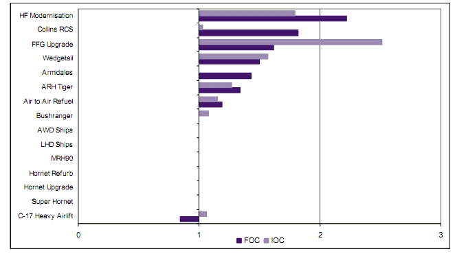 3.12 Developmental projects on both new and existing capabilities are most susceptible to delays. Upgrades to existing capabilities, such as the FFG Upgrade project, pose unique problems associated with refit and life of type extension work being undertaken in conjunction with capability upgrade work. Developmental projects which also have a high dependence on the availability of platforms already in service, such as the mobile platform components of the HF Modernisation project and the Collins RCS project, have a higher potential for schedule slippage.