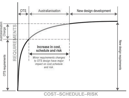 3.34 Implementation: An important part of the two-pass Government approval process is consideration of off-the-shelf options to satisfy capability needs or an explanation of why such an option is not available. Any option that proposes Australianisation of OTS equipment must detail the rationale, and associated costs and risks. As some of the lessons recorded by DMO MPR projects show, the extent of Australianisation of an off-the-shelf equipment solution can introduce significant project risk. Figure 3.9 below illustrates the disproportionate impact that seemingly small changes to off-the-shelf equipment can have on cost, schedule and risk.