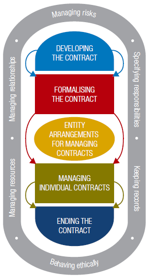 Contracting is an integral part of the way the Australian Government conducts business. Contracting activity ranges from straightforward procurements that can be made, for example, using a government credit card or purchase order through to highly complex, innovative long term projects that may involve a number of inter-connected contracting arrangements. The Australian Government is a significant purchaser of goods and services. These purchases comprise thousands of transactions and involve billions of dollars annually. The Australian Government has in place a range of legislation and related policies that set out the framework for contracting. This Part of the Guide provides a summary of, or a reference to, the legislation and policy that can impact on contracting activities. In addition to the legislative and policy framework, there are a number of factors that are important at all stages of the contracting process. These are: • managing risks • managing relationships • managing resources • specifying responsibilities • behaving ethically, and • keeping records. Each of these issues is introduced in this Part and discussed in more detail where relevant in Parts 2 to 6 of the Guide. These factors, together with the phases of the procurement cycle addressed by this Guide, are illustrated in Figure 2 below. | Contracting is an integral part of the way the Australian Government conducts business. |
