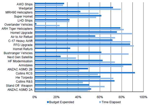 2.3 Figure 2 sets out two of these measures: percentage of budgeted cost expended and percentage of the scheduled time elapsed. The figure shows that, for most projects, the budgeted cost expended is broadly in line with the proportion of time that has elapsed in projects' schedules.37 38 The main exceptions include the two Collins Class Submarine projects (replacement combat system, and reliability and sustainability enhancements), where most of the materiel has been acquired and expenditure undertaken, but difficulties in obtaining a sufficient amount of time in the submarines' full cycle docking program to install the equipment has pushed out each project's schedule. In other cases, issues related to contractor delivery against the contract (Air to Air Refuel) and delays in entering into the contract (Overlander Vehicles - Medium/Heavy Capability) have impacted on the extent of budgeted cost expended relative to the current point in their planned schedule.