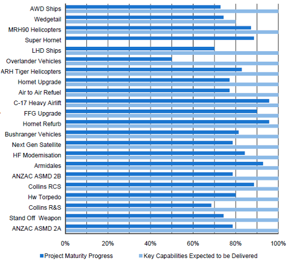 2.5 While the DMO's key capability measures should be interpreted with some caution due to their lack of rigour as a data system and the high level of uncertainty in forecasting outcomes,41 overall, the DMO's assessment is that 20 of the 21 projects with key capability data in this year's MPR will deliver all their key capability requirements. The project of note that is not expected to deliver all its key capability requirements is Wedgetail, where the system's radar performance is not expected to meet the required current specification at final delivery.