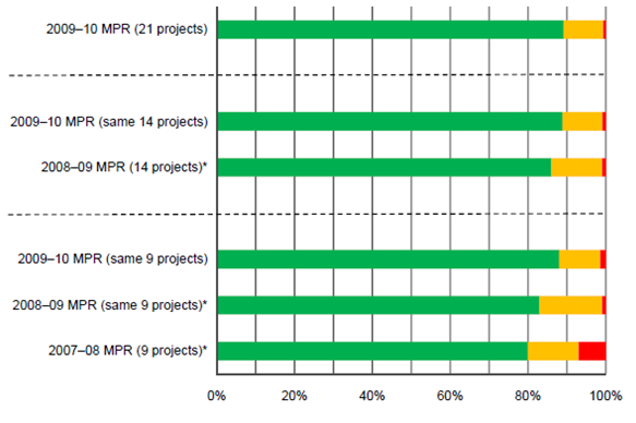2.31 Figure 10 examines the DMO's assessment about the likely delivery of the MOEs for the nine Major Projects in the first MPR (2007-08 MPR); 14 of the 15 Major Projects in the second MPR (2008-09 MPR); and the 21 Major Projects including MOEs in this year's PDSSs. The DMO's data suggests that increasingly, a greater proportion of key performance measures are considered likely to be met for the portfolio of projects covered by the MPR.
