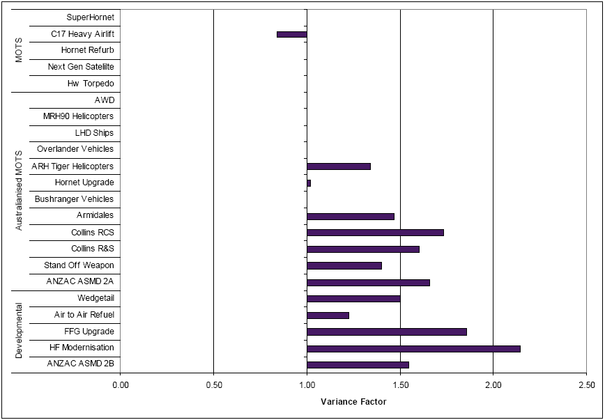 ● Schedule Slippage - All developmental projects and over half of the Australianised MOTS projects have incurred slippage to the schedule approved at Second Pass. By contrast, none of the five MOTS projects has experienced schedule slippage. This slippage is attributable to the higher levels of complexity and risk for these developmental and Australianised MOTS projects. As this report has shown, the higher the technical challenge, the higher the inherent risk to schedule. Developmental projects are new and often at the leading edge of available technology. As such, it is not uncommon for projects to encounter unforeseen technical difficulties requiring significant modification, thereby having a negative impact on schedule. Similarly, Australianisation can also encounter unforeseen technical difficulties and have an unanticipated impact on existing features of the baseline MOTS product. The rectification of such issues often requires extensive, time consuming remediation work.