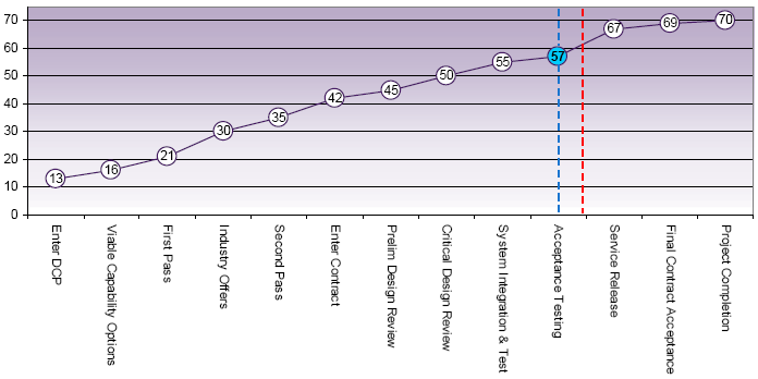 Explanation | • Schedule: This attribute measures where in the project life cycle the project is with respect to delivering the ISD capability. The difference between the benchmark and current project score is due to the achievement of MRH90 ISD and because the first eleven MRH aircraft and support systems have been accepted into service. • Requirement: This attribute measures how well a requirement is being realised. The difference between the benchmark and current project score is due to the MRH System design and acceptance testing phases being essentially complete. Additionally, the project office, with Navy and Army, is conducting validation trials to demonstrate that the system meets in-service requirements. • Operations and Support: This attribute measures how prepared the project is to deliver an operating system. The difference between the benchmark and current project score is because the MRH System has commenced progressive transition from the acquisition environment to the in-service support and operational organisations. | ||||||||
