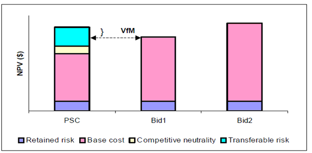 Value for money is demonstrated when the total present value cost of private sector supply is less than the net present value of the base cost of the service, adjusted for:
