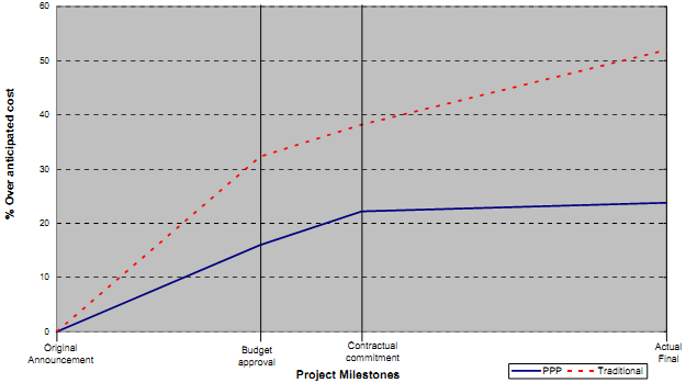 Over all time periods considered in this study, PPPs delivered projects for a price that is far closer to the expected cost than if the project was procured in the Traditional manner. Based on the inter-quartile percentage for the period from initial project announcement to the actual final cost, PPPs were 31.5% better than traditional projects. | |