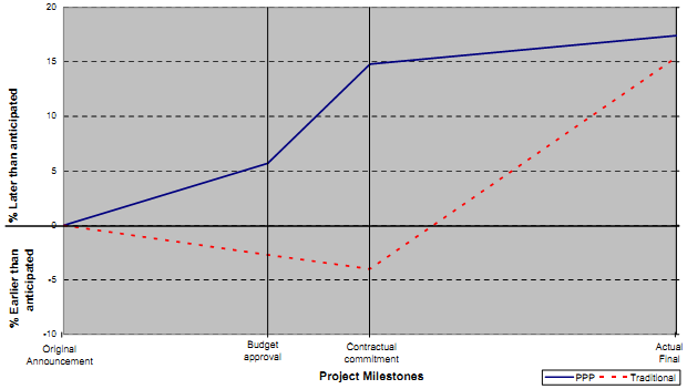 Over the period from initial announcement of a project to when it is finally commissioned PPPs and Traditional projects are delivered with the same confidence in the likely overall time performance. | |