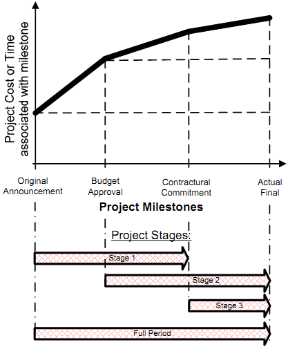 | • Full period • Stage 1 • Stage 2 • Stage 3 | Original Announcement to Actual Final; Original Announcement to Contractual Commitment; Budget Approval to Actual Final; and Contractual Commitment to Actual Final. |
