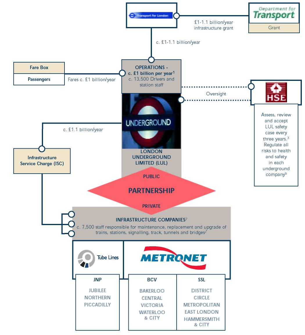 Tube operations and infrastructure are run through a partnership between four parties - LUL and three private infrastructure companies. They are paid through a combination of grant and farebox revenue (also see text on facing page).