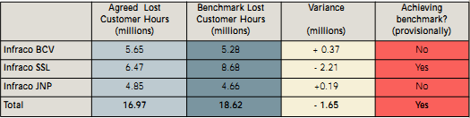 | Agreed availability performance (measured in Lost Customer Hours) in the first year is better than the total contractual benchmark, although there is variation between Infracos and responsibility for some £14.4 million worth of service disruptions still to be assigned as at mid-May 2004 - see Section A4.3. These disruptions, if agreed in LUL's favour, could materially change overall availability performance. |