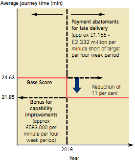 | The Infracos must deliver higher capability by certain dates, or else incur payment abatements. The chart below shows how the incentives are intended to encourage timely delivery of a line upgrade on the District Line. |